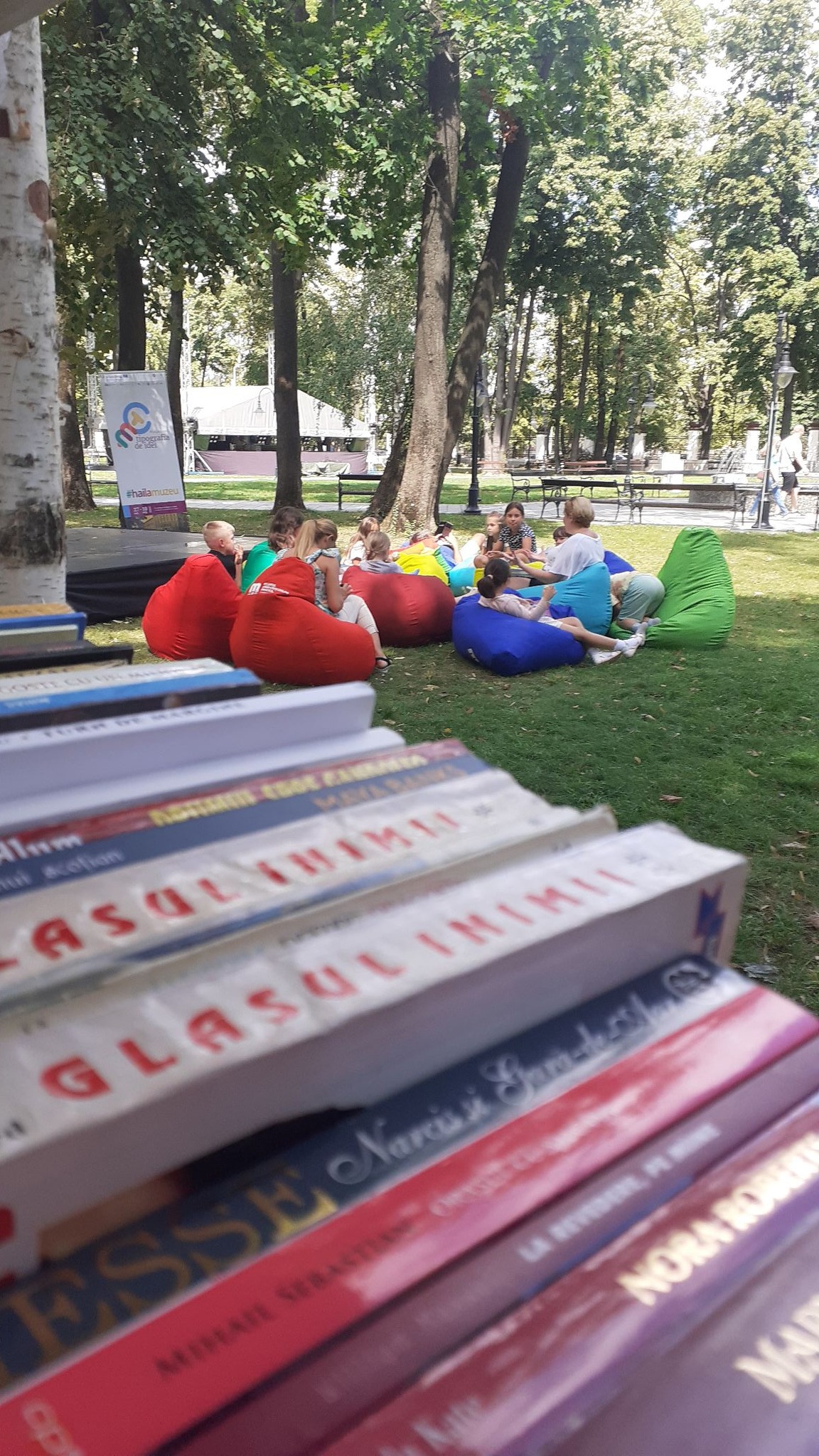 Romane biografice, de dragoste, polițiste sau de aventuri invită la lectură pe bănci sau pe pufuri la umbra copacilor care țin căldura toridă de august la distanță.