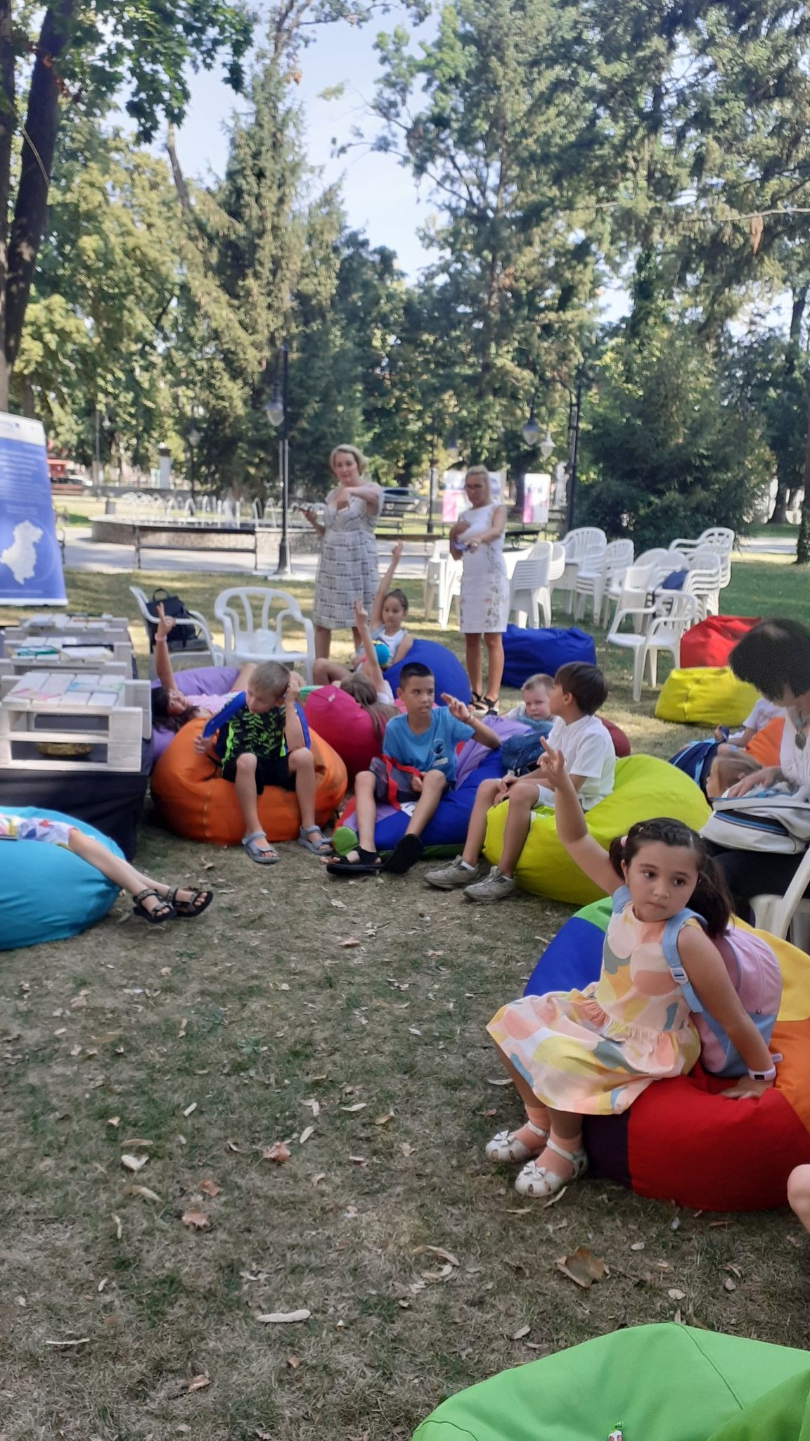 Bibliotecari ai bibliotecii județene asigură animația, dau informații, fac recomandări de lectură sau chiar lectură pentru copiii și grupurile care doresc.